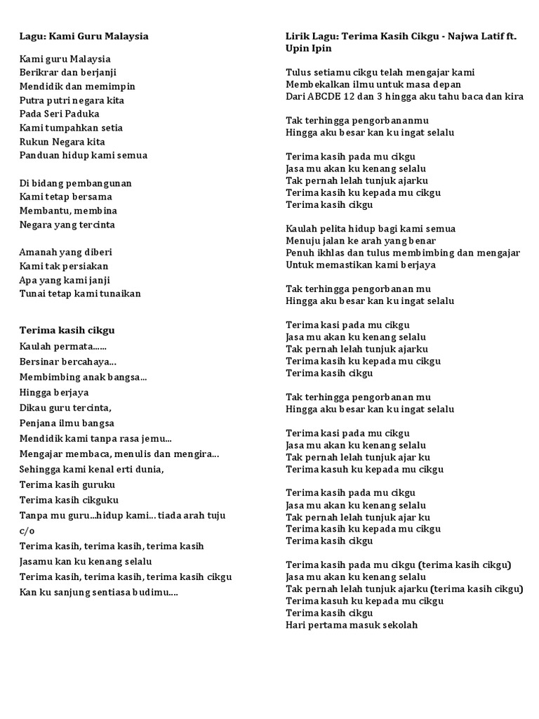 Senarai lagu tema hari guru. Lirik lagu kami guru malaysia. Amanah yang diberi kami tak persiakan apa yang kami janji tunai tetap kami tunaikan. Lirik lagu kami guru malaysia (lagu hari guru) kami guru malaysia berikrar dan berjanji mendidik dan memimpin putra putri negara kita. Download lagu kami guru malaysia (vokal) download lagu kami guru malaysia (minus one) download pendidik bumi kenyalang.